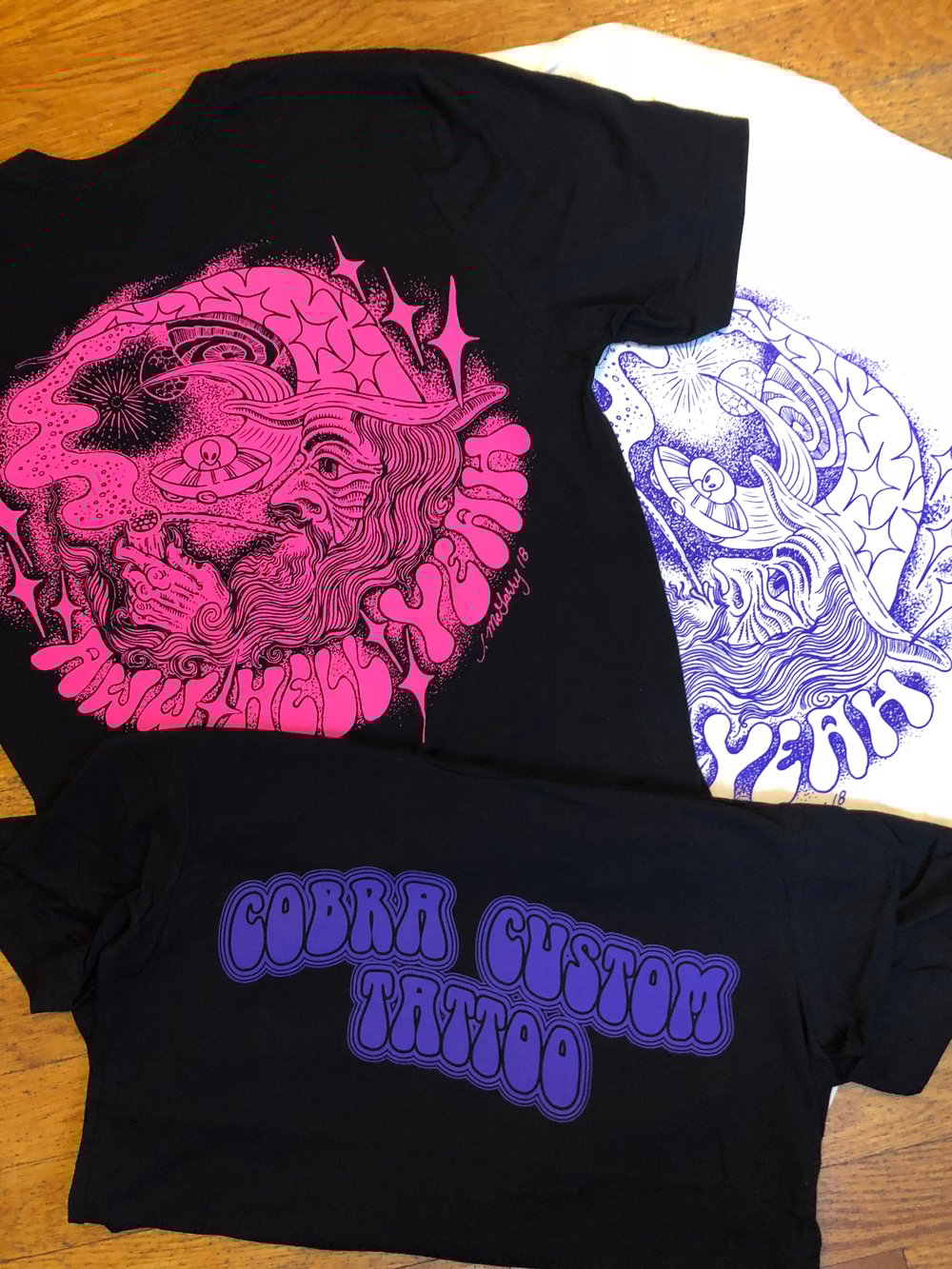 Short sleeve t-shirt with single color printing on front and back. Available in 3 color ways: Pink ink on Black shirt, Purple ink on Black shirt, or Purple ink on Natural shirt.